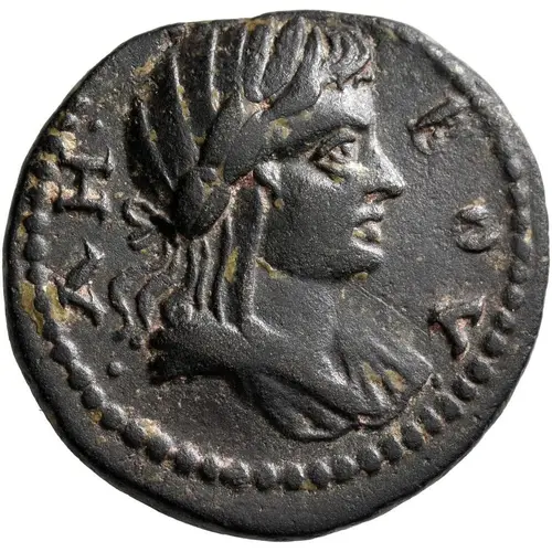 | Reverse description | Tyche standing facing, head to left, holding rudder in her right hand and cornucopiae in her left. |