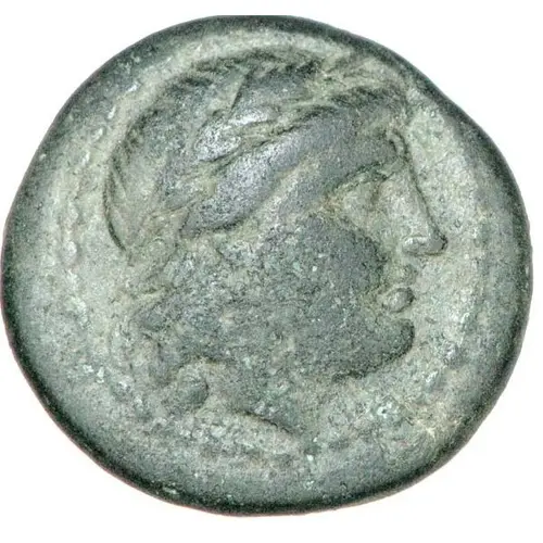 Technical/Grading: Struck on a copper flan (17mm, 2.72g), this Dichalkon exhibits characteristics common to base metal coinage of the era. High-points for wear on the obverse include Apollo's hair, forehead, and nose. On the reverse, the amphora's rim and handles are critical areas. Due to copper's nature and striking techniques, examples may show irregular flan shapes, off-centering, or areas of strike weakness. Surface preservation, including patination and absence of significant corrosion, is paramount for optimal grading.