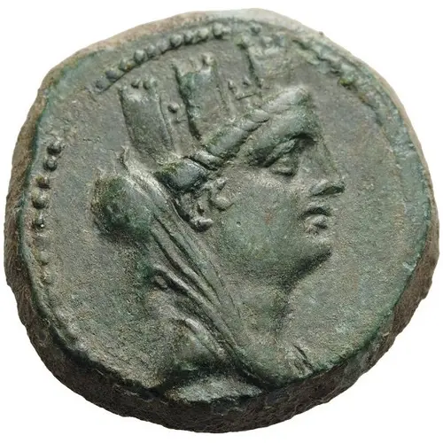 Beschrijving voorzijde Bust of Tyche to right, wearing turreted crown and veil