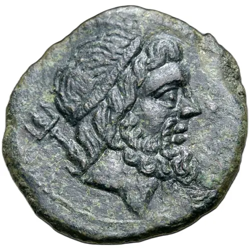 | Ön yüz açıklaması | Wreathed head of Poseidon to right; trident to left. |