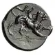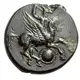 Mô tả mặt trước Bellerophon riding Pegasus towards the right, wearing a petasos and hurling a spear held in his upraised right hand. Below, a round shield