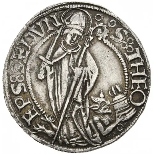 Technical/Grading: Struck on a substantial 8.17 gram silver flan, this Dicken exhibits characteristics of late 15th-century hammer-struck coinage. High-points for wear or strike weakness include the bishop's mitre or saint's head, central shield elements, and legend borders. Variations in strike centering and pressure are common, leading to areas of flatness or incomplete detail, especially on the periphery. Planchet quality can vary, sometimes showing minor irregularities inherent to the period's production.