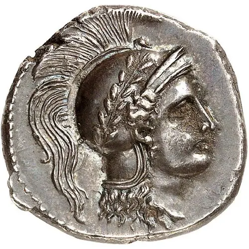| Obverse description | Head of Athena right, wearing helmet decorated with long wreath and berries; swan`s head in front of crest-holder. |