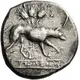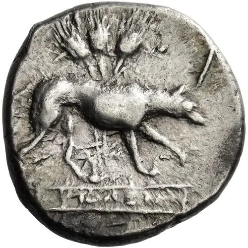 | Obverse description | Hunting dog `Cirneco of the Etna` standing right; behind, three stalks of barley. Below, in oblong frame, IRVKAZIB. |