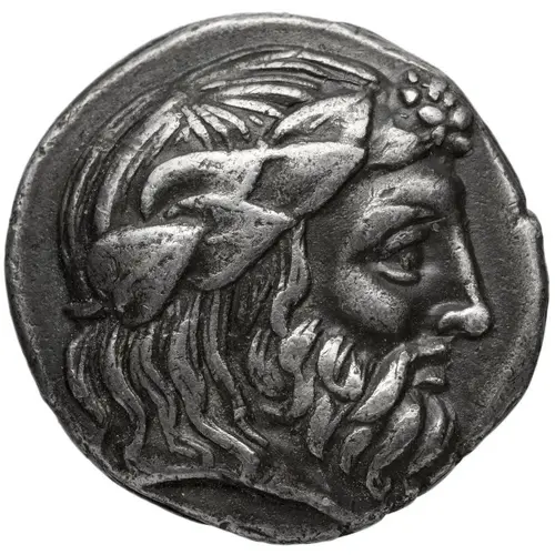 | Description de l’avers | Bearded head of Dionysos to right, wearing wreath of ivy leaves with berries at his forehead. |