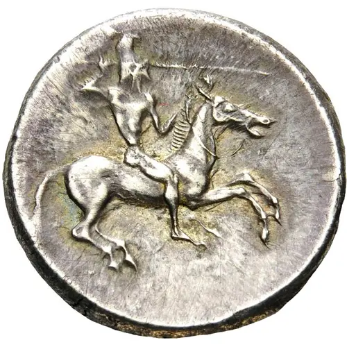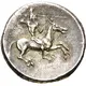 | Obverse description | Rider galloping to right, bearded and nude but for high helmet, hurling spear with his raised right hand |