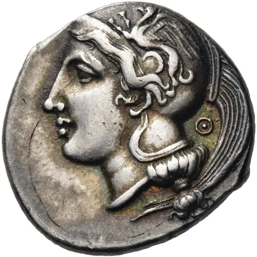 | Description de l’avers | Head of Athena to left, wearing Attic helmet adorned with a griffin and with her hair in a pony-tail tied at the end; behind her neck, Θ. |