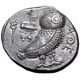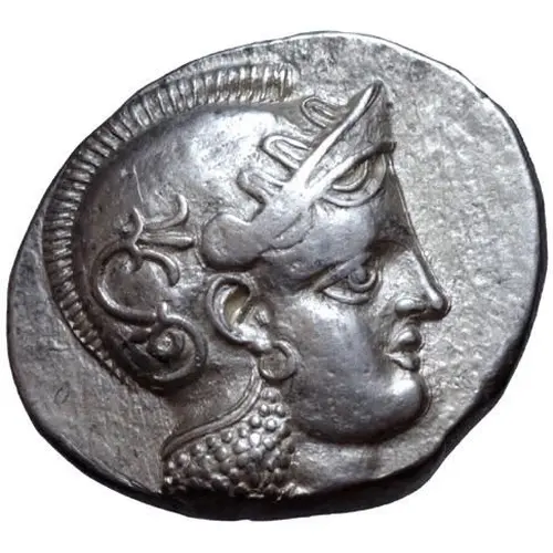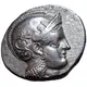 | Obverse description | Head of Athena right, wearing earring, necklace, and crested Attic helmet decorated with three olive leaves over visor and a spiral palmette on the bowl. |