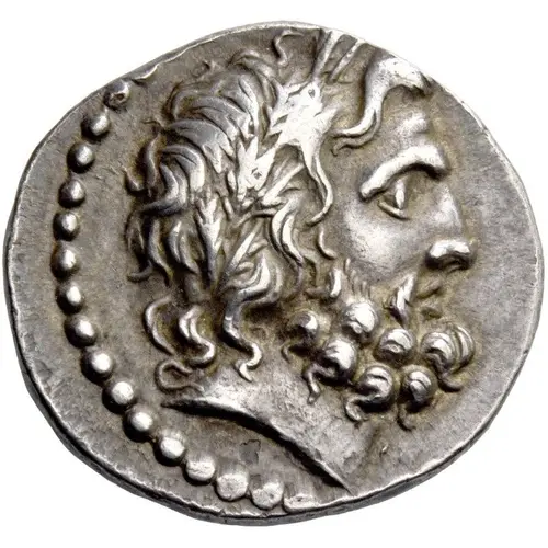 表面の説明 Laureate head of Zeus right.
