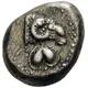 | Popis rubu | Silphium fruit (seed pod?) between two dolphins swimming around it to right and all within incuse square |