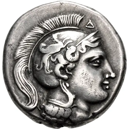 | Obverse description | Head of Athena right, wearing crested Attic helmet decorated with griffin; Δ above visor, Φ before throat |
