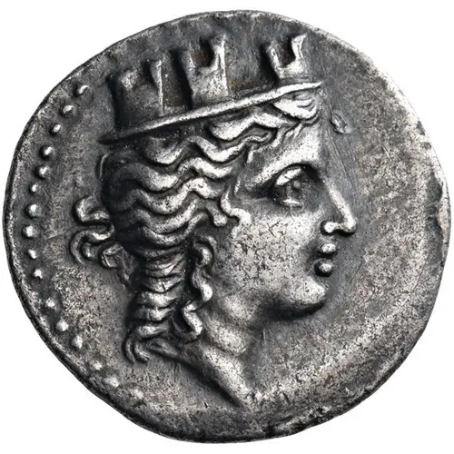 Opis rewersu Eagle with spread wings walking to right; before him, palm tree; in field to right, horizontal Σ with its point upwards above Τ; all within olive wreath.