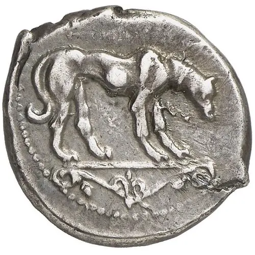 | Obverse description | Hound standing to right, his head lowered; in exergue, ornament. |