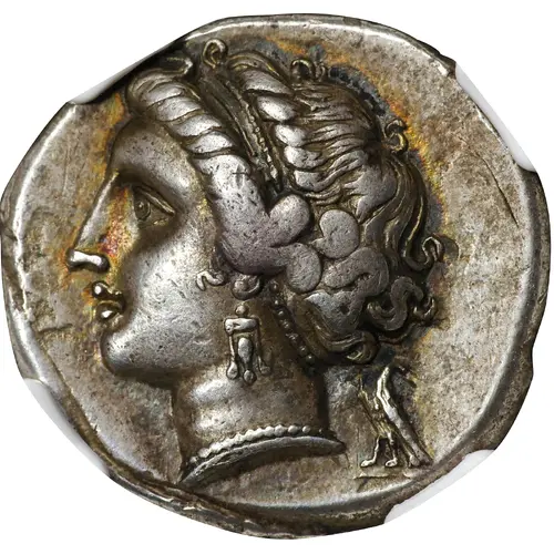 | Obverse description | Head of nymph to left, eagle looking back behind her neck. |