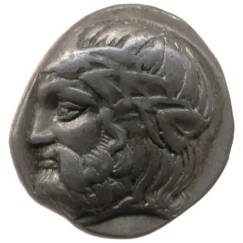 | Popis líce | Bearded head of Dionysos to left, wearing wreath of ivy leaves with berries at his forehead. |