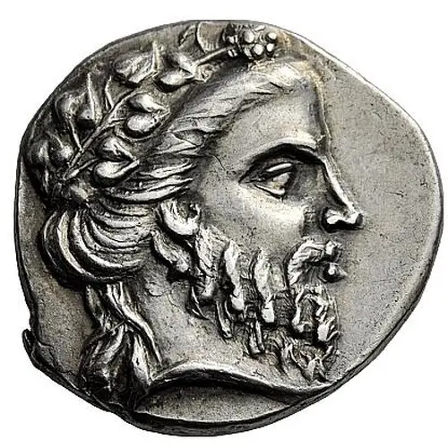 | 正面描述 | Head of bearded Dionysos to right, wearing ivy wreath |