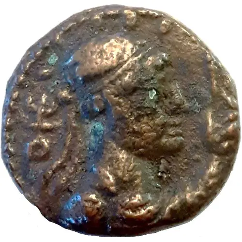 Diademed and draped bust of sun-god Miiro right, 5 rays radiating from his head, arrow tied with ribbons raised in right hand, 3 pronged tamga left [description from Forum Ancient Coins label] |