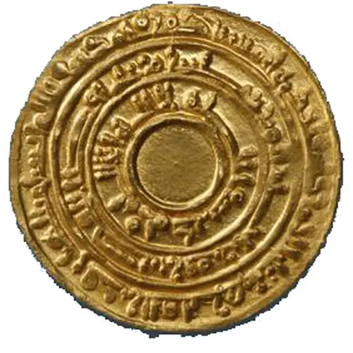 (Translation: Inner circle: “the one who exalts the religion of God, Commander of the Faithful” Middle circle: “the Imam Ma’add summons (everyone) to profess the eternal unity of God” Outer circle: In three concentric circles with a plain central circle “In the name of God this dinar was struck in Misr”)