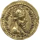 | Obverse description | A portrait of the king facing right, in Parthian-style headdress (kulah) edged along the borders with tow rows of `pearls`. There is an ornament made of `pearls` on the kulah. The central ornament is a six-pointed star. The hair covered by bashlyk edged with `pearls`, and ribbons with bows flow out from the kulah. Around his neck the King wears a necklace in the form of tow hoops. There is a pointed rim around the picture. |