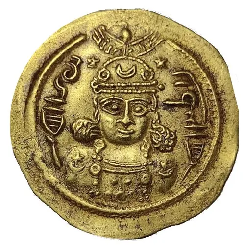 | Reverse description | Full portrait of dressed Buran with a round crown with crescent and glob. Right hand on breast, a dagger in left hand. Two flowers at right and left, imitating her bunches of hair. Two stars and crescents at right and left of head. Legend around. A pellet out of margin at 1. |