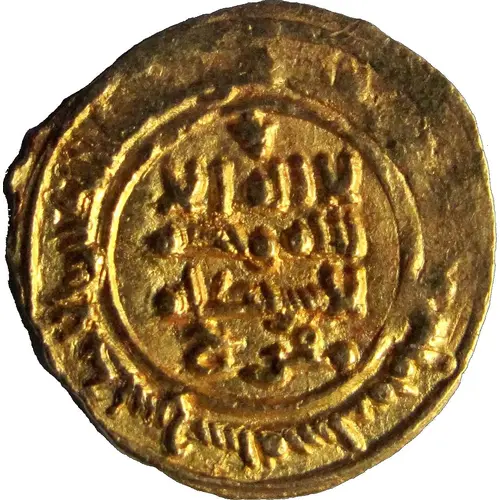 (Translation: There is no diety except God alone He has no equal Mufariy In the name of God. This Dinar was struck in al-Andalus in the year three hundred and eighty six)