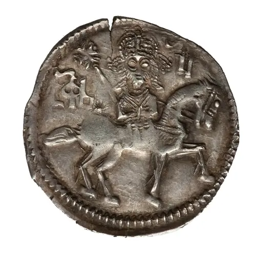 | Obverse description | Dusan on horseback facing, crowned and in loros, holding cruciform scepter, Serbian initials |