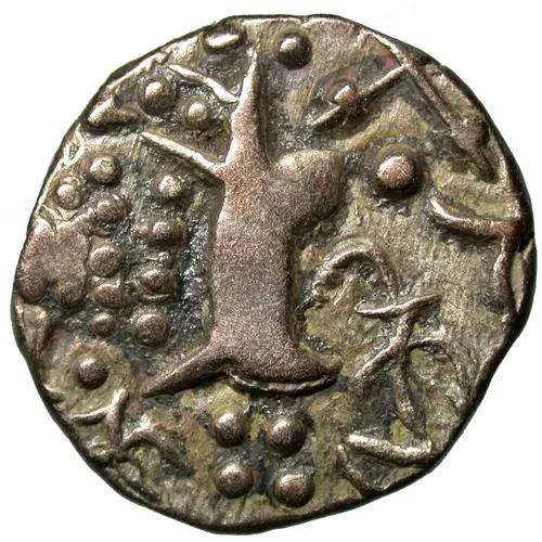 | Obverse description | Formalized Kushan standing king. Brahmi characters beneath arm |