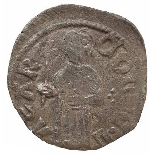 Technical/Grading: Struck in silver, this small Dinar measures 14 mm and weighs approximately 0.7 gg. Common technical characteristics include irregular flans, often exhibiting incomplete strikes or minor off-centering, typical for medieval hand-struck coinage. High-points for wear are generally the facial features and extremities of the standing ruler on the obverse, and Christ's head and knees on the reverse. Collectors should expect varying strike quality, with fully centralized and well-detailed examples being scarcer.