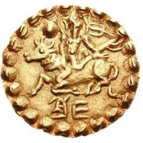 Opis awersu Nimbate Shiva riding upon his steed, Nandi, with trident in hand. Stylized sun on left, denticled border.