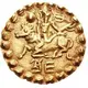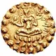 Opis rewersu Seated Nimbate Lakshmi on Lotus, with bilva fruit and conch. Lettering around, denticled border.