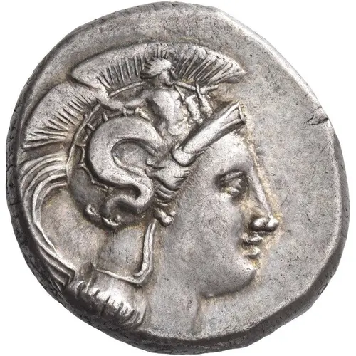 | Popis líce | Head of Athena right, wearing crested Attic helmet decorated with Scylla hurling stone. |