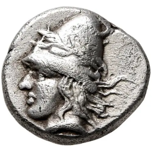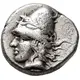 | توضیحات روی سکه | Head of a young Kabeiros to left, wearing laureate conical cap. |