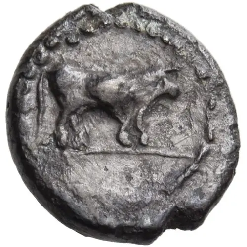 Mô tả mặt trước Bull standing to right, on groundline; border of dots.