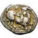 | Aversbeschreibung | He-goat moving right, head turned back to left. In field, two pellets |