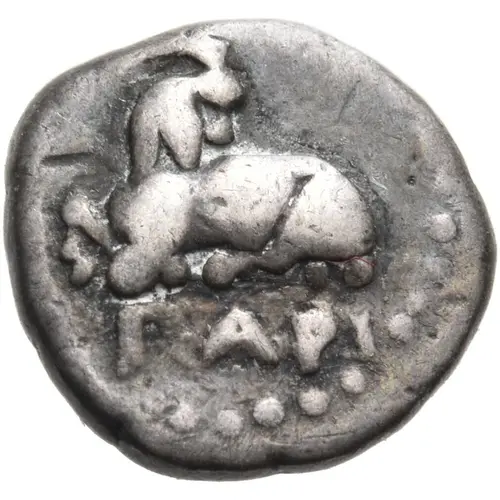 Obverse description Goat seated to left, his head turned back to right; border of dots.