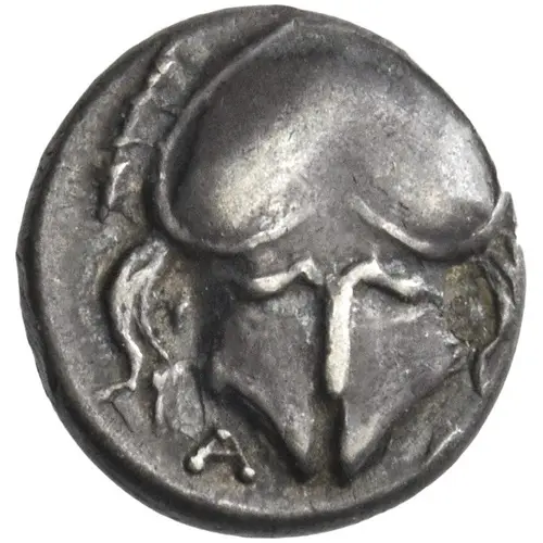 | Obverse description | Crested Corinthian helmet; below, A. |
