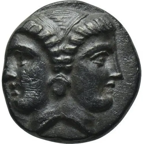 | Obverse description | Female janiform heads wearing taenia and shared earring. |