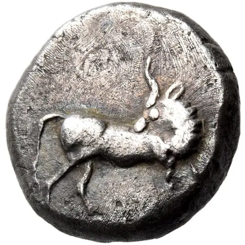| Obverse description | Cow standing to right, head turned back to left. |