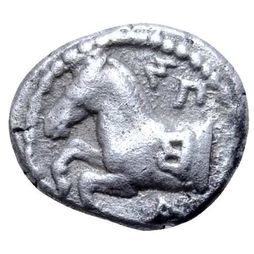 | Opis awersu | Protome of a horse facing left. Retrograde B on the body of the horse. |
