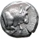 | Reverse description | Forepart of bull right within square incuse. |