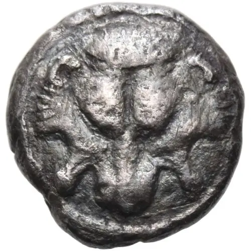 | Reversbeschreibung | Prow of a Samaina galley to left; in field to left, crestless Corinthian helmet to left. |
