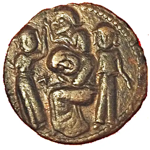 | Obverse description | Four figures, three standing and one seated in the middle with star in front, in dotted circle |