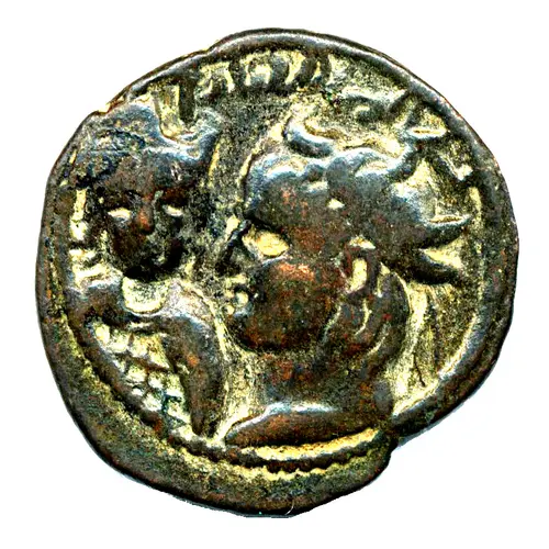 Obverse description Large diademed Roman-style male head on the right, facing left in profile, hair dishevelled; smaller crowned Byzantine-style bust facing forward with garment.legend in late Kufic in an arc above, from 2 to 11 o`clock, bearing the ruler`s personal laqab and the title Malik Diyarbakr; all within a beaded circle.