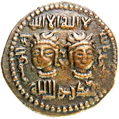 Two diademed male heads facing, but turned slightly away from one another above la ilah illa allah, below muhammad rasul allah, at right upwards al-mustanjid billah, at left downwards amir al-mu’minin “no god but God Muhammad is the messenger of God, al-Mustanjid billah, Commander of the Faithful” |