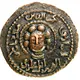 In centre female head facing with a beaded circle interrupted by neck at bottom; hair arranged in six rolls, above: najm al-Din, below alpi ibn il-ghazi, on right upwards ibn artuq, on left downwards: malik diyar bakr “Star of the Faith, Alpi ibn Il-Ghazi ibn Artuq, Ruler of Diyarbakir” |