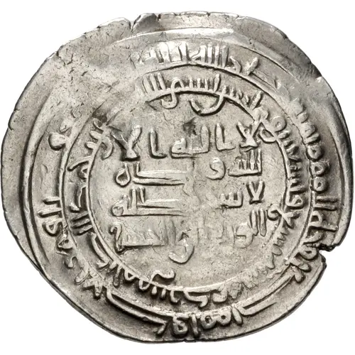 | 正面铭文 | (Translation: Field: lā ilāha illā / Allāh waḥdahū / lā sharīka lahū Inner Margin: bism Allāh ḍuriba hādhā al-dirham bi [mint] sana [year] Outer Margin: li-llāh al-amr min qabl wa min baʿd wa yawmaʾidhin yafraḥu al-muʾminūn bi naṣr Allāh Field: There is no deity but Allah, the One, there is no partner to Him Inner Margin: In the name of Allah, this dirham was struck in [mint] in the year [year] Outer Margin: To Allah belongs the command before and after, and on that day the believers will rejoice with the help of Allah) |