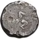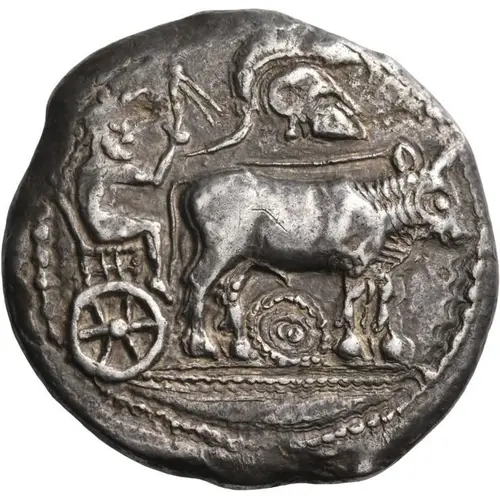 | Description de l’avers | Male driver, wearing petasos and robes, seated to right on a throne-like chair mounted on a two-wheeled ox-cart, holding the reins in his left hand and a curious goad in his raised right; above, crested Corinthian helmet to right; below oxen, elaborate disc. |
