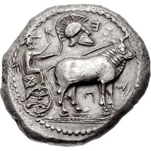 | Beschrijving voorzijde | Driver, holding goad in right hand, reins in left, driving ox cart right; above, crested Corinthian helmet right, Π between legs, I to right, Ǝ above. |
