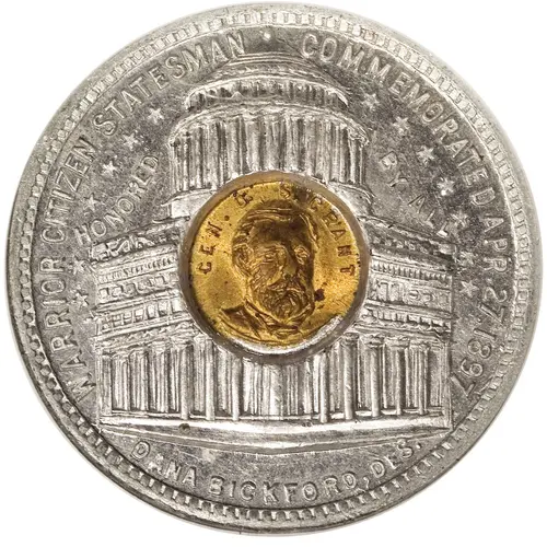 Warrior Citizen Statesman * Commemorated Apr. 27, 1897 Dana Bickford Des.; between upper border legend and tomb, semi-circle of 13 stars; to l. of tomb dome, Honored; to r., by All |