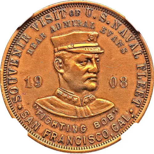 | Obverse lettering | SOUVENIR VISIT OF U.S. NAVAL FLEET TO PACIFIC COAST REAR ADMIRAL EVANS `FIGHTING BOB` SAN FRANCISCO, CAL |